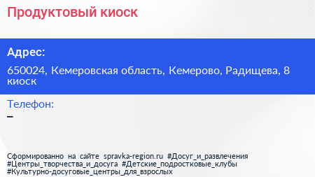 Продуктовый киоск по адресу 650024, Кемеровская область, Кемерово, Радищева, 8 киоск в дальнейшем Организация, размещена в следующих категориях: