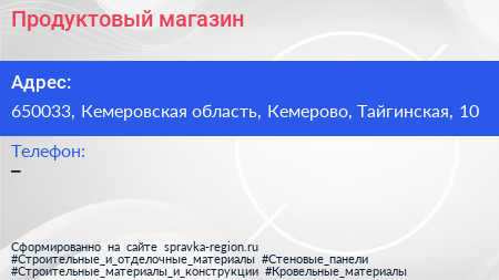 Продуктовый магазин по адресу 650033, Кемеровская область, Кемерово, Тайгинская, 10 в дальнейшем Организация, размещена в следующих категориях: