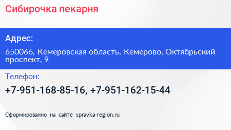 Сибирочка, пекарня по адресу 650066, Кемеровская область, Кемерово, Октябрьский проспект, 9 в дальнейшем Организация, размещена в следующих категориях: