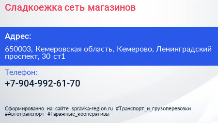 Сладкоежка, сеть магазинов по адресу 650003, Кемеровская область, Кемерово, Ленинградский проспект, 30 ст1 в дальнейшем Организация, размещена в следующих категориях: