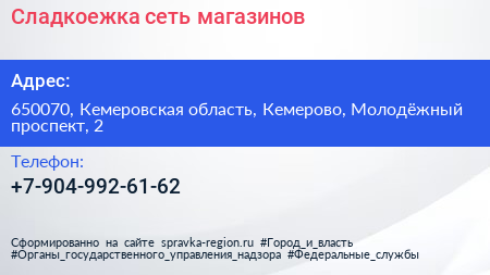 Сладкоежка, сеть магазинов по адресу 650070, Кемеровская область, Кемерово, Молодёжный проспект, 2 в дальнейшем Организация, размещена в следующих категориях: