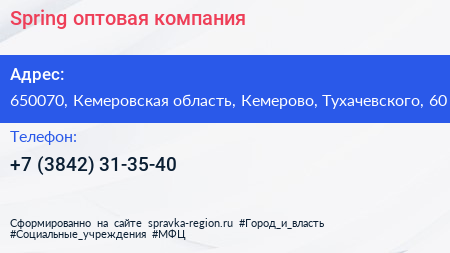 Spring, оптовая компания по адресу 650070, Кемеровская область, Кемерово, Тухачевского, 60 в дальнейшем Организация, размещена в следующих категориях: