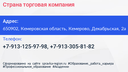 Страна, торговая компания по адресу 650902, Кемеровская область, Кемерово, Декабрьская, 2а в дальнейшем Организация, размещена в следующих категориях: