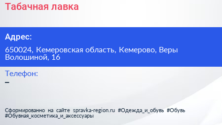 Табачная лавка по адресу 650024, Кемеровская область, Кемерово, Веры Волошиной, 16 в дальнейшем Организация, размещена в следующих категориях: