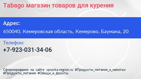 Tabago, магазин товаров для курения по адресу 650040, Кемеровская область, Кемерово, Баумана, 20 в дальнейшем Организация, размещена в следующих категориях: