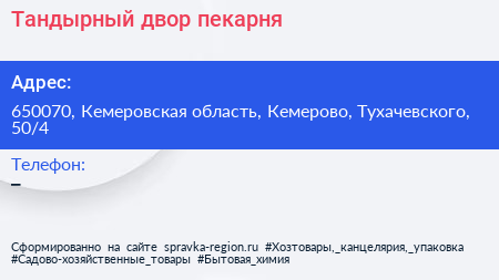 Тандырный двор, пекарня по адресу 650070, Кемеровская область, Кемерово, Тухачевского, 50/4 в дальнейшем Организация, размещена в следующих категориях: