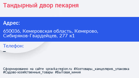 Тандырный двор, пекарня по адресу 650036, Кемеровская область, Кемерово, Сибиряков-Гвардейцев, 277 к1 в дальнейшем Организация, размещена в следующих категориях: