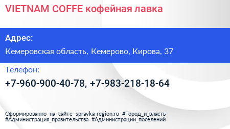 VIETNAM COFFE, кофейная лавка по адресу Кемеровская область, Кемерово, Кирова, 37 в дальнейшем Организация, размещена в следующих категориях: