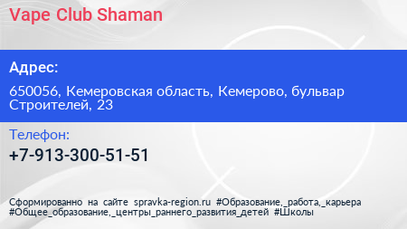 Vape -Club Shaman по адресу 650056, Кемеровская область, Кемерово, бульвар Строителей, 23 в дальнейшем Организация, размещена в следующих категориях: