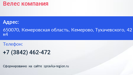 Велес, компания по адресу 650070, Кемеровская область, Кемерово, Тухачевского, 42 к4 в дальнейшем Организация, размещена в следующих категориях: