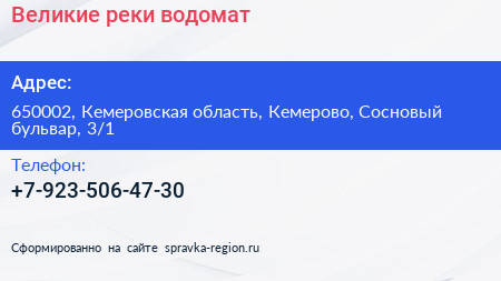 Великие реки, водомат по адресу 650002, Кемеровская область, Кемерово, Сосновый бульвар, 3/1 в дальнейшем Организация, размещена в следующих категориях: