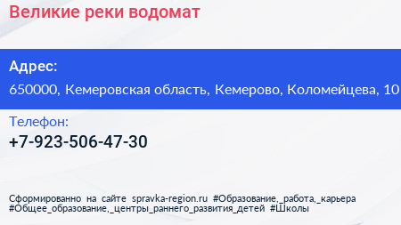 Великие реки, водомат по адресу 650000, Кемеровская область, Кемерово, Коломейцева, 10 в дальнейшем Организация, размещена в следующих категориях: