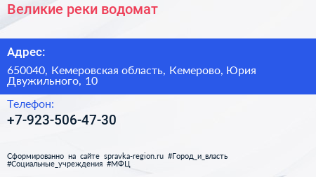 Великие реки, водомат по адресу 650040, Кемеровская область, Кемерово, Юрия Двужильного, 10 в дальнейшем Организация, размещена в следующих категориях: