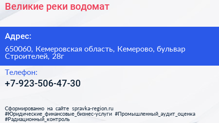 Великие реки, водомат по адресу 650060, Кемеровская область, Кемерово, бульвар Строителей, 28г в дальнейшем Организация, размещена в следующих категориях: