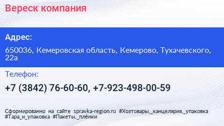 Вереск, компания по адресу 650036, Кемеровская область, Кемерово, Тухачевского, 22а в дальнейшем Организация, размещена в следующих категориях: