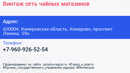 Винтаж, сеть чайных магазинов по адресу 650004, Кемеровская область, Кемерово, проспект Ленина, 59а в дальнейшем Организация, размещена в следующих категориях: