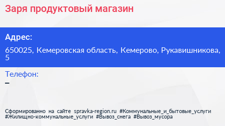 Заря, продуктовый магазин по адресу 650025, Кемеровская область, Кемерово, Рукавишникова, 5 в дальнейшем Организация, размещена в следующих категориях: