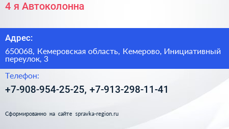 4-я Автоколонна по адресу 650068, Кемеровская область, Кемерово, Инициативный переулок, 3 в дальнейшем Организация, размещена в следующих категориях: