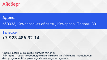 Айсберг по адресу 650033, Кемеровская область, Кемерово, Попова, 30 в дальнейшем Организация, размещена в следующих категориях: