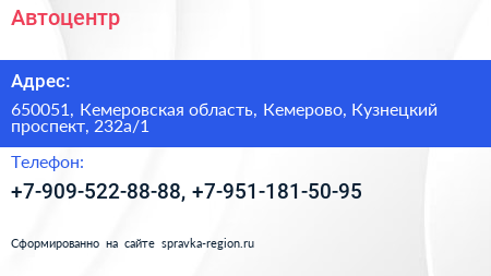 Автоцентр по адресу 650051, Кемеровская область, Кемерово, Кузнецкий проспект, 232а/1 в дальнейшем Организация, размещена в следующих категориях: