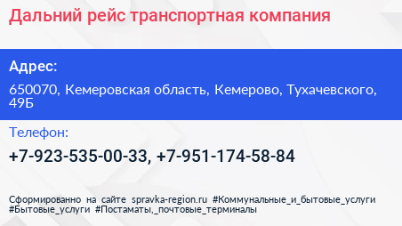 Дальний рейс, транспортная компания по адресу 650070, Кемеровская область, Кемерово, Тухачевского, 49Б в дальнейшем Организация, размещена в следующих категориях: