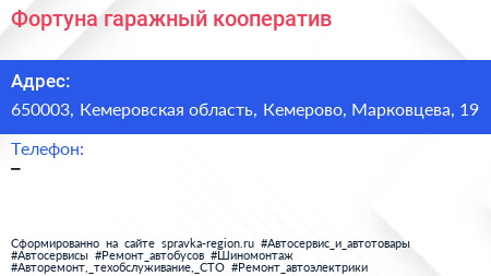 Фортуна, гаражный кооператив по адресу 650003, Кемеровская область, Кемерово, Марковцева, 19 в дальнейшем Организация, размещена в следующих категориях: