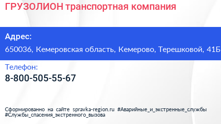 ГРУЗОЛИОН, транспортная компания по адресу 650036, Кемеровская область, Кемерово, Терешковой, 41Б в дальнейшем Организация, размещена в следующих категориях:
