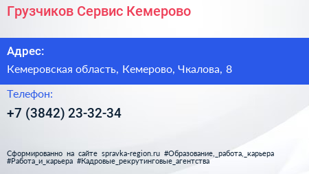 Грузчиков Сервис Кемерово по адресу Кемеровская область, Кемерово, Чкалова, 8 в дальнейшем Организация, размещена в следующих категориях: