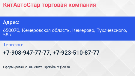 КитАвтоСтар, торговая компания по адресу 650070, Кемеровская область, Кемерово, Тухачевского, 58в в дальнейшем Организация, размещена в следующих категориях: