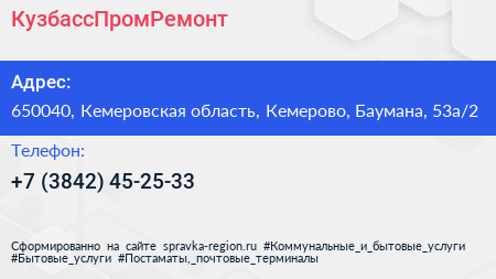 КузбассПромРемонт по адресу 650040, Кемеровская область, Кемерово, Баумана, 53а/2 в дальнейшем Организация, размещена в следующих категориях: