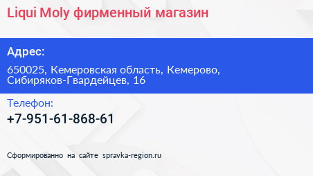 Liqui Moly, фирменный магазин по адресу 650025, Кемеровская область, Кемерово, Сибиряков-Гвардейцев, 16 в дальнейшем Организация, размещена в следующих категориях: