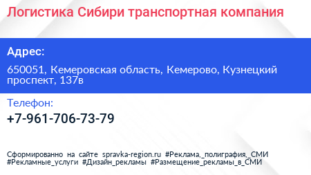 Логистика Сибири, транспортная компания по адресу 650051, Кемеровская область, Кемерово, Кузнецкий проспект, 137в в дальнейшем Организация, размещена в следующих категориях: