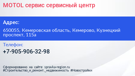 MOTOL сервис, сервисный центр по адресу 650055, Кемеровская область, Кемерово, Кузнецкий проспект, 115а в дальнейшем Организация, размещена в следующих категориях: