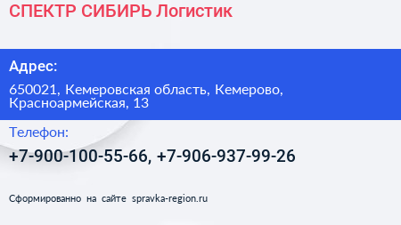 СПЕКТР СИБИРЬ Логистик по адресу 650021, Кемеровская область, Кемерово, Красноармейская, 13 в дальнейшем Организация, размещена в следующих категориях: