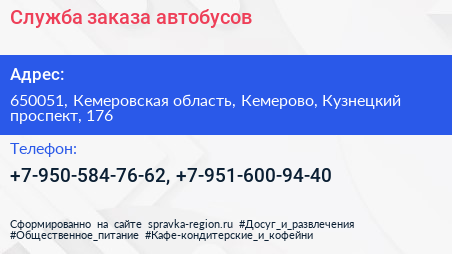 Служба заказа автобусов по адресу 650051, Кемеровская область, Кемерово, Кузнецкий проспект, 176 в дальнейшем Организация, размещена в следующих категориях: