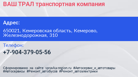 ВАШ ТРАЛ, транспортная компания по адресу 650021, Кемеровская область, Кемерово, Железнодорожная, 310 в дальнейшем Организация, размещена в следующих категориях:
