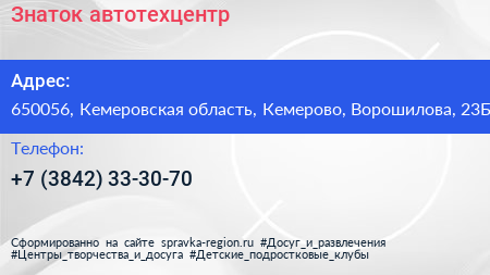Знаток, автотехцентр по адресу 650056, Кемеровская область, Кемерово, Ворошилова, 23Б в дальнейшем Организация, размещена в следующих категориях: