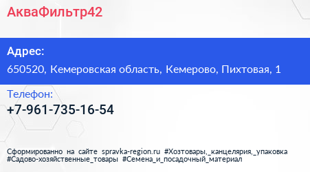 АкваФильтр42 по адресу 650520, Кемеровская область, Кемерово, Пихтовая, 1 в дальнейшем Организация, размещена в следующих категориях: