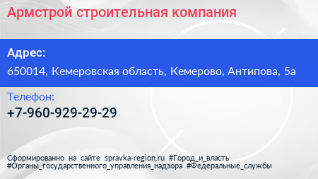 Армстрой, строительная компания по адресу 650014, Кемеровская область, Кемерово, Антипова, 5а в дальнейшем Организация, размещена в следующих категориях: