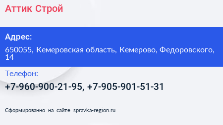 Аттик-Строй по адресу 650055, Кемеровская область, Кемерово, Федоровского, 14 в дальнейшем Организация, размещена в следующих категориях: