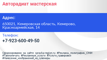 Авторадиат, мастерская по адресу 650021, Кемеровская область, Кемерово, Красноармейская, 14 в дальнейшем Организация, размещена в следующих категориях: