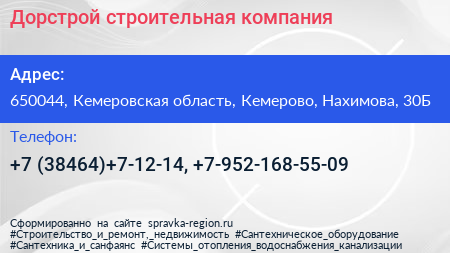 Дорстрой, строительная компания по адресу 650044, Кемеровская область, Кемерово, Нахимова, 30Б в дальнейшем Организация, размещена в следующих категориях: