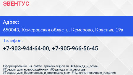 ЭВЕНТУС по адресу 650043, Кемеровская область, Кемерово, Красная, 19а в дальнейшем Организация, размещена в следующих категориях: