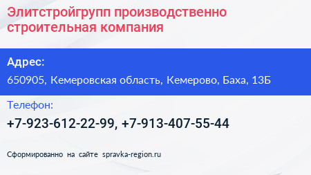 Элитстройгрупп, производственно-строительная компания по адресу 650905, Кемеровская область, Кемерово, Баха, 13Б в дальнейшем Организация, размещена в следующих категориях: