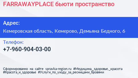 FARRAWAYPLACE, бьюти-пространство по адресу Кемеровская область, Кемерово, Демьяна Бедного, 6 в дальнейшем Организация, размещена в следующих категориях: