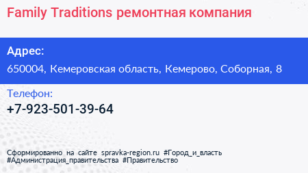 Family Traditions, ремонтная компания по адресу 650004, Кемеровская область, Кемерово, Соборная, 8 в дальнейшем Организация, размещена в следующих категориях: