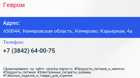 Гевром по адресу 650044, Кемеровская область, Кемерово, Карьерная, 4а в дальнейшем Организация, размещена в следующих категориях: