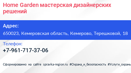 Home & Garden, мастерская дизайнерских решений по адресу 650023, Кемеровская область, Кемерово, Терешковой, 18 в дальнейшем Организация, размещена в следующих категориях: