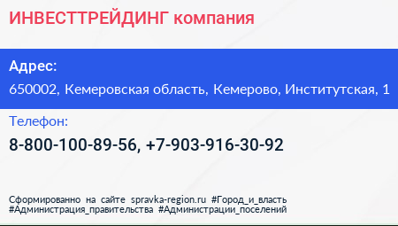 ИНВЕСТТРЕЙДИНГ, компания по адресу 650002, Кемеровская область, Кемерово, Институтская, 1 в дальнейшем Организация, размещена в следующих категориях: