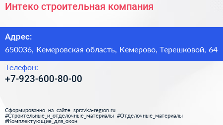 Интеко, строительная компания по адресу 650036, Кемеровская область, Кемерово, Терешковой, 64 в дальнейшем Организация, размещена в следующих категориях: